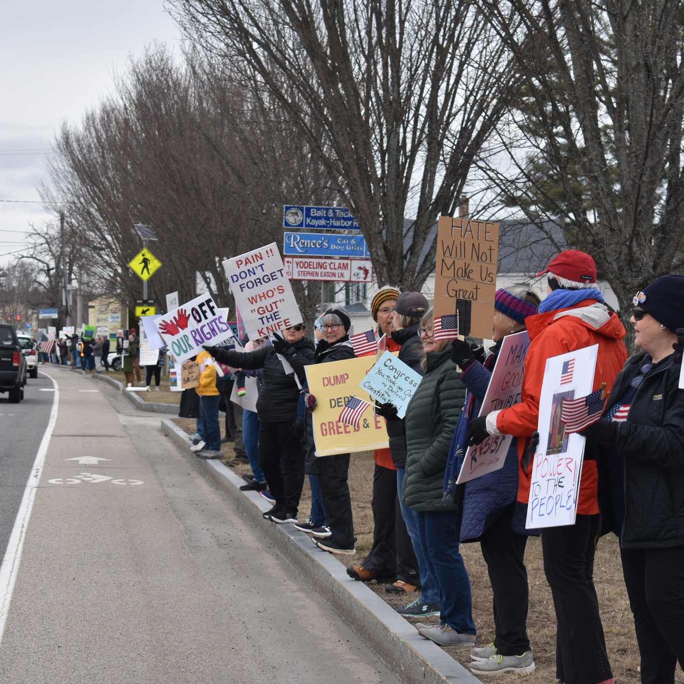 Our protests in Wells are organized in conjunction with Indivisible and other national organizations (MoveOn, ACLU, 50501) and local organizations like Activate Maine and Democratic town committees. Mobilize is the tool we use to register people for our standouts in Wells. Sign up for our mailing list to get alerts about upcoming events.